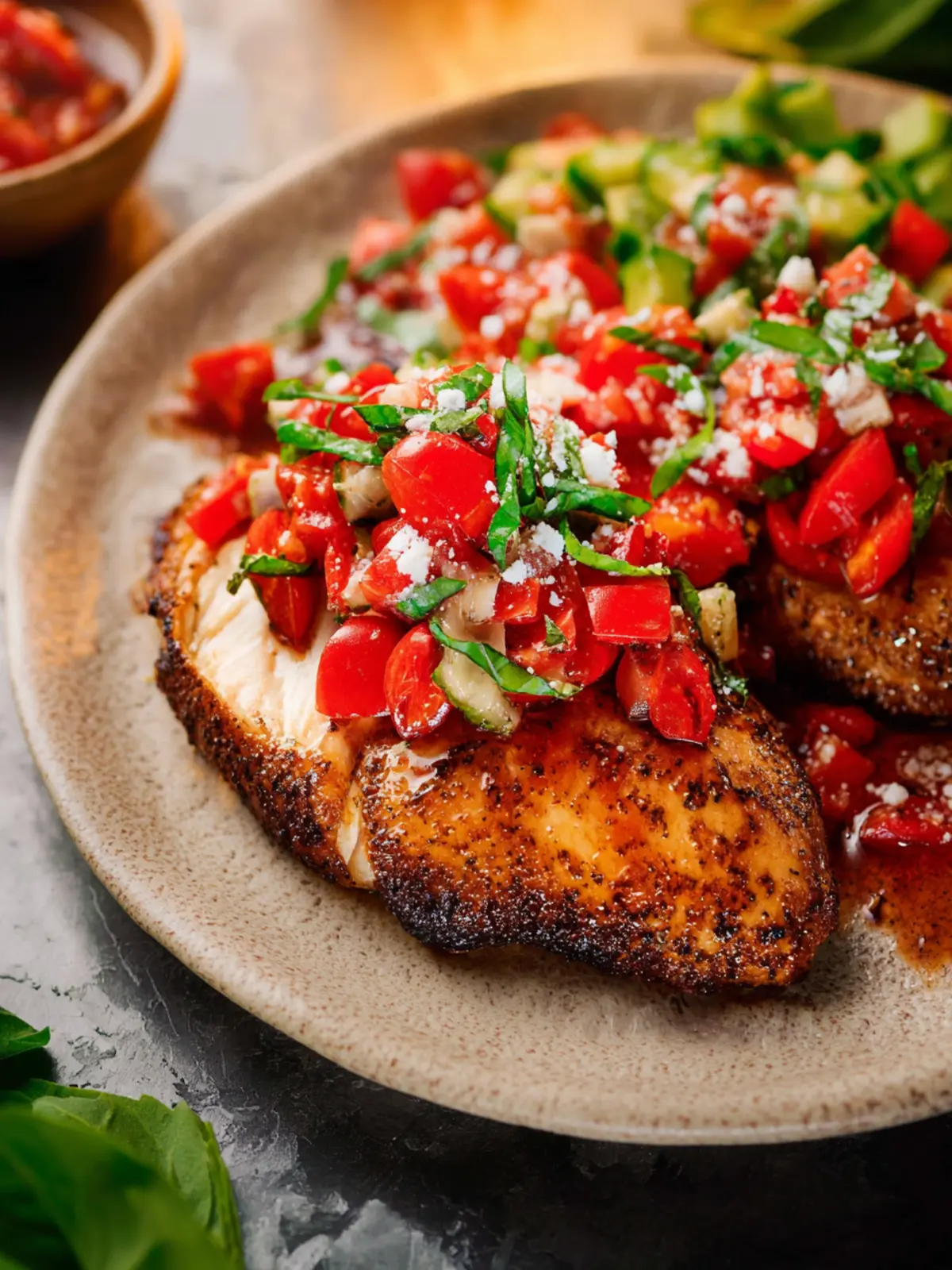A refreshing dish of grilled chicken served with quinoa and a flavorful bruschetta topping.