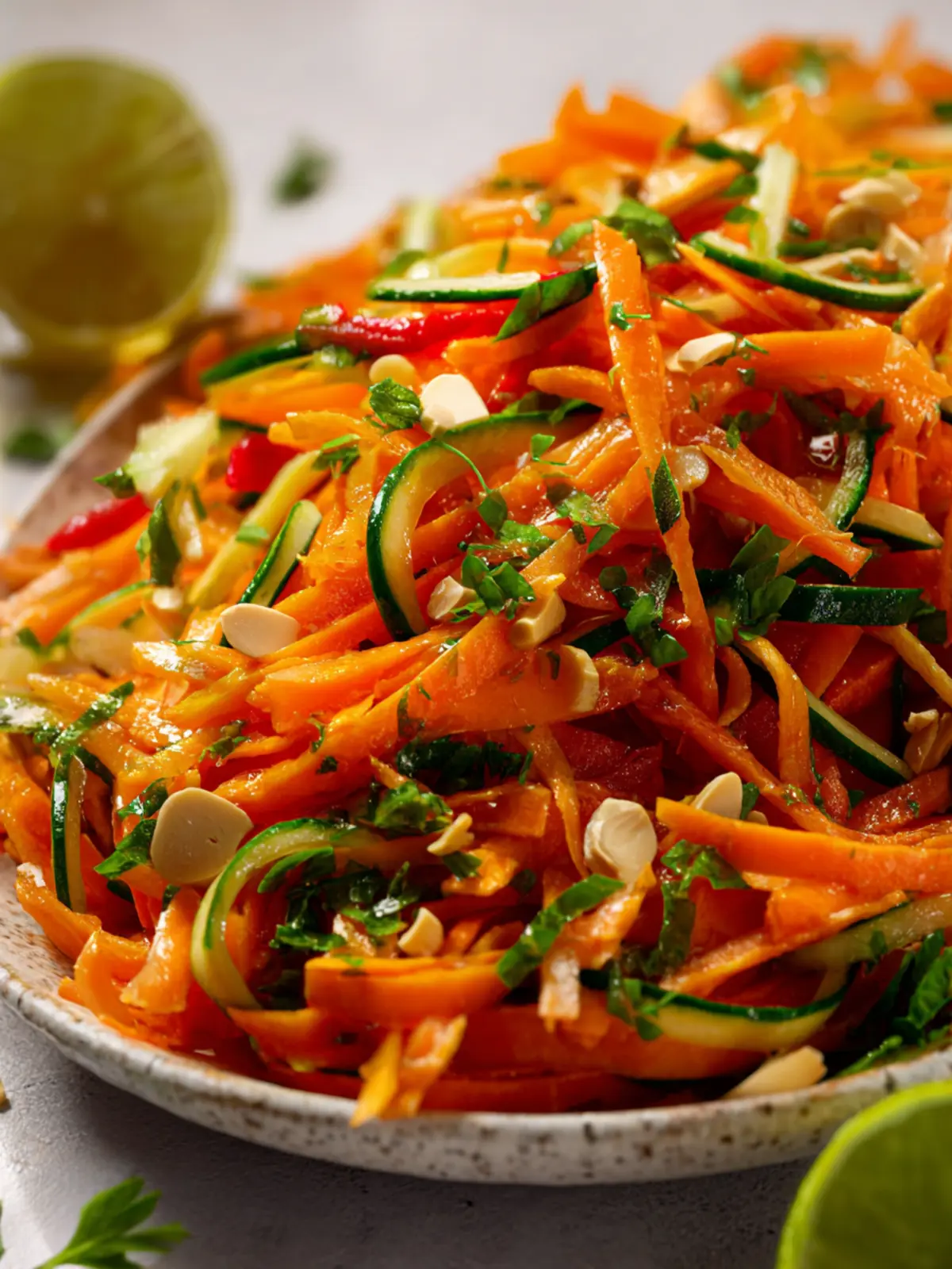 3. Add carrot and cucumber noodles to a large bowl and toss with the dressing until evenly coated.