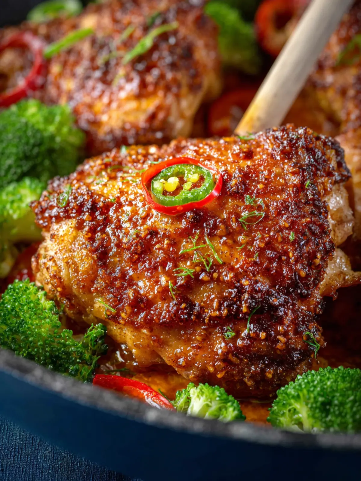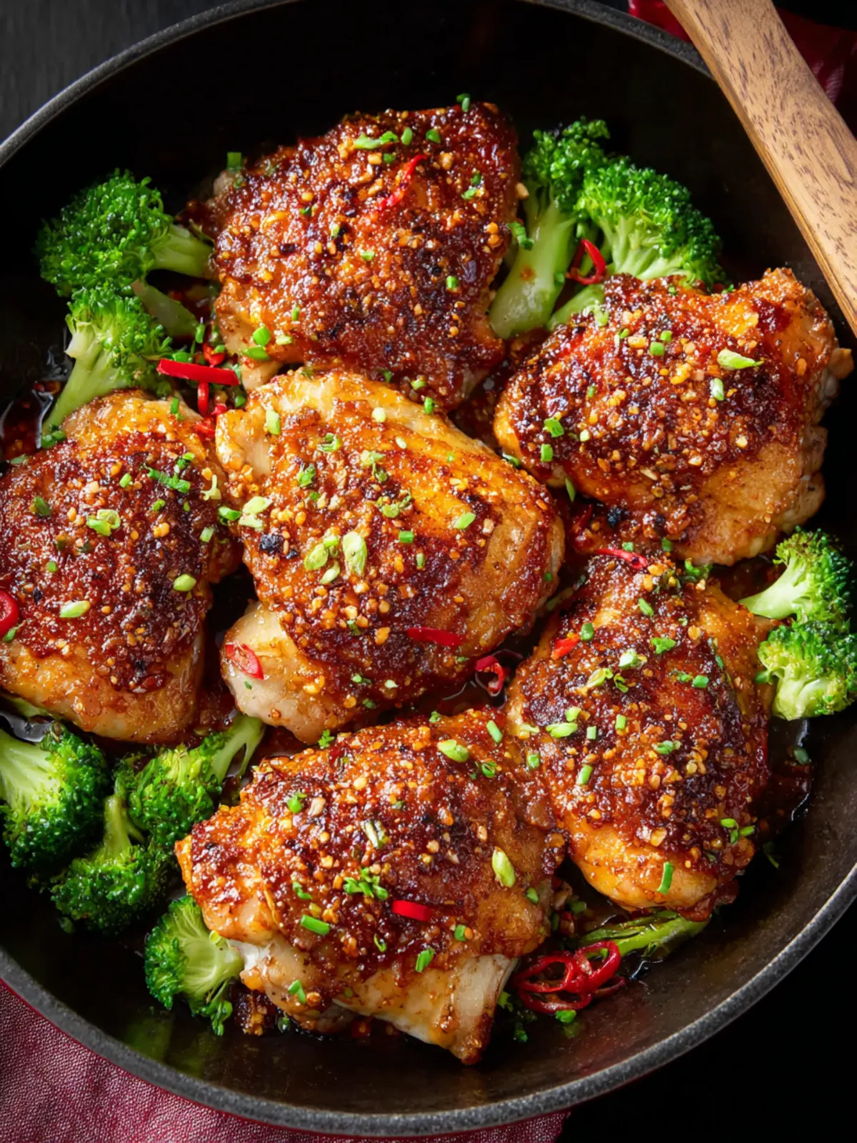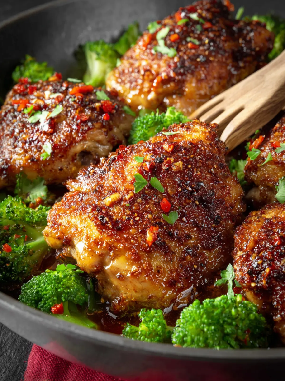 Enjoy these flavorful garlic chili oil chicken thighs paired with roasted broccoli for a delicious meal.