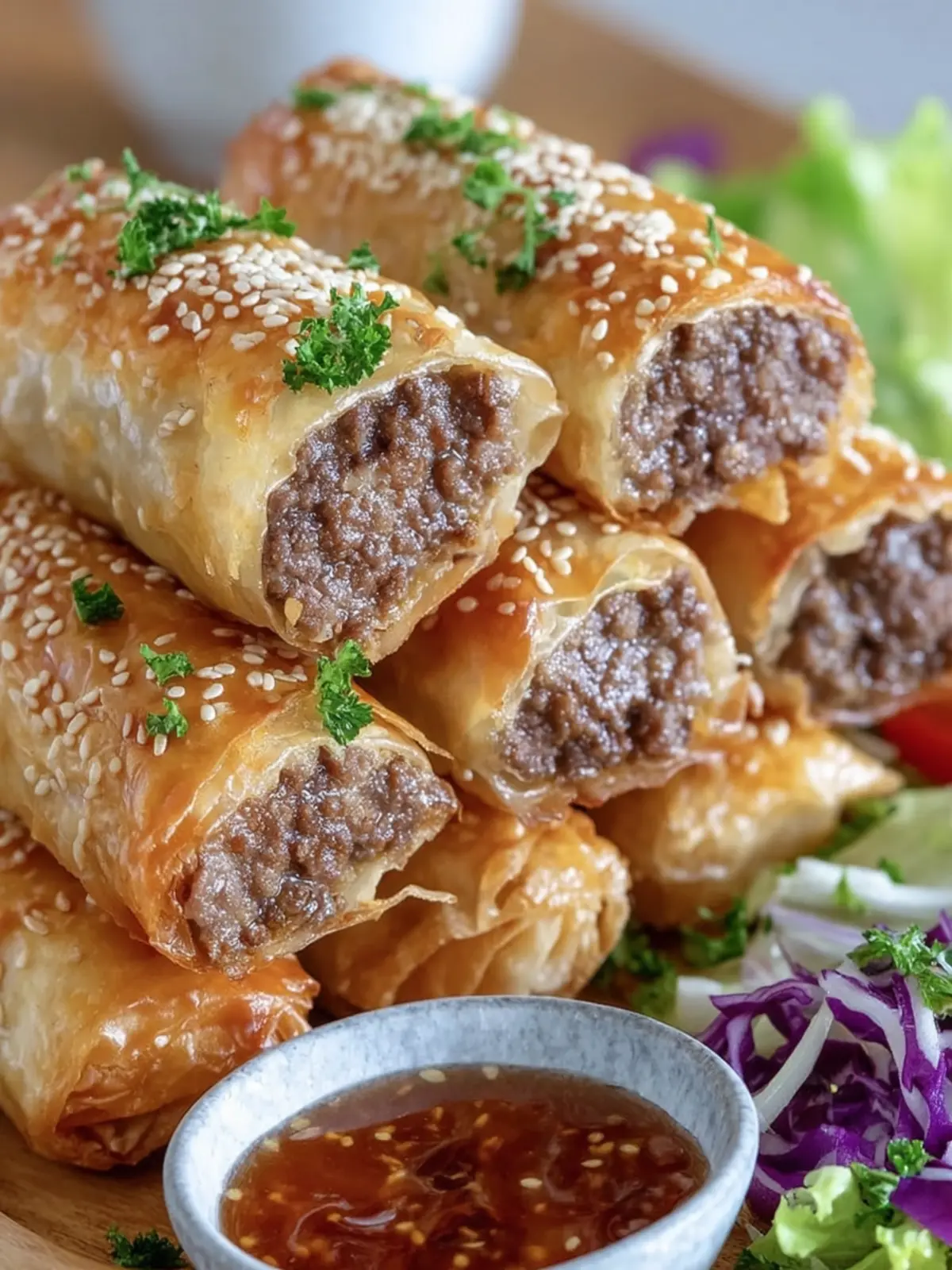 What sets these rolls apart is their contrast in textures: the airy, crisp pastry envelops a juicy, spiced beef filling. This combination not only satisfies your craving for something crunchy but also ensures you get a burst of flavor in each bite.
