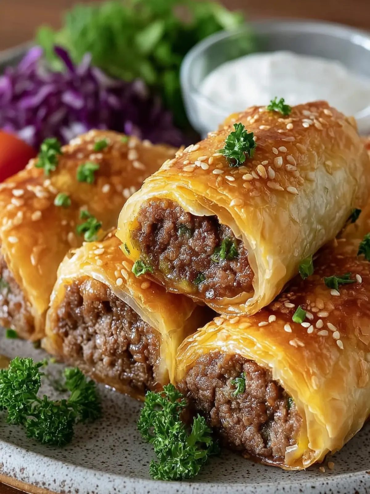 A delicious and crispy appetizer featuring seasoned ground beef wrapped in flaky filo pastry.