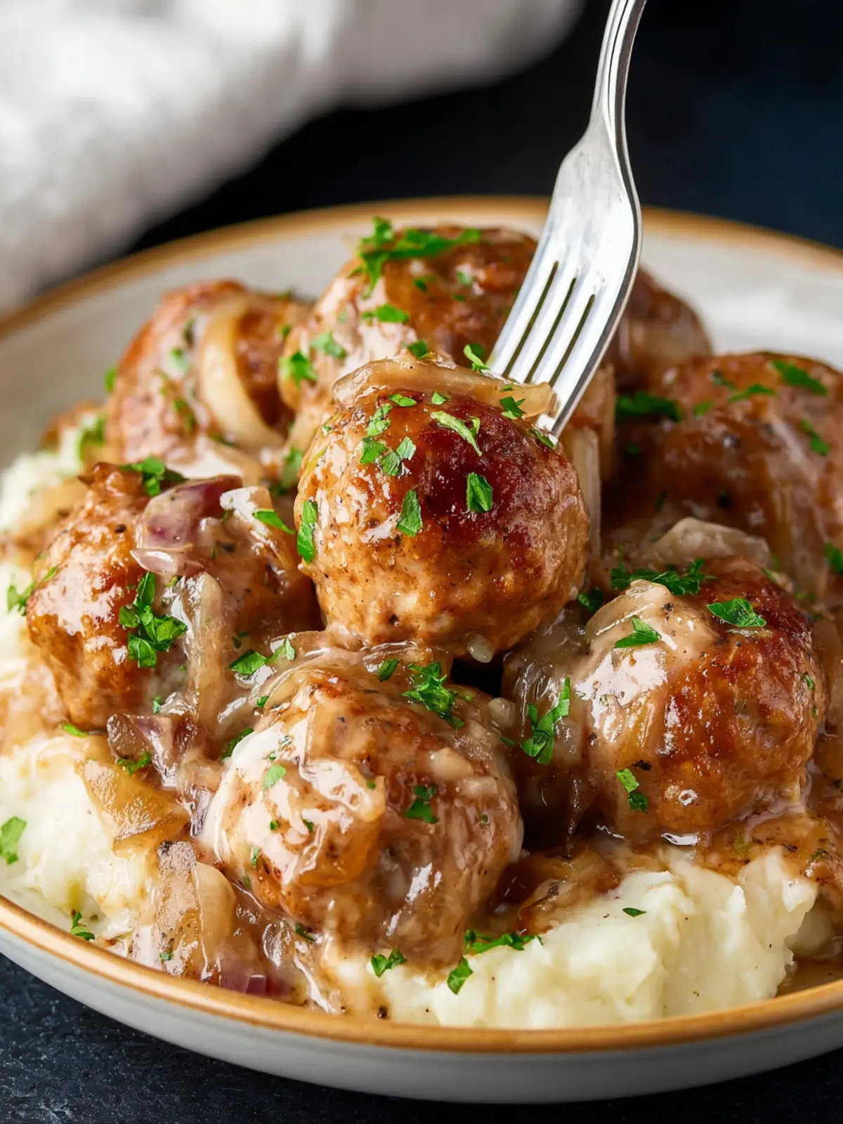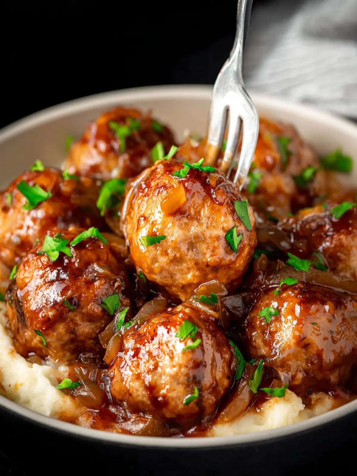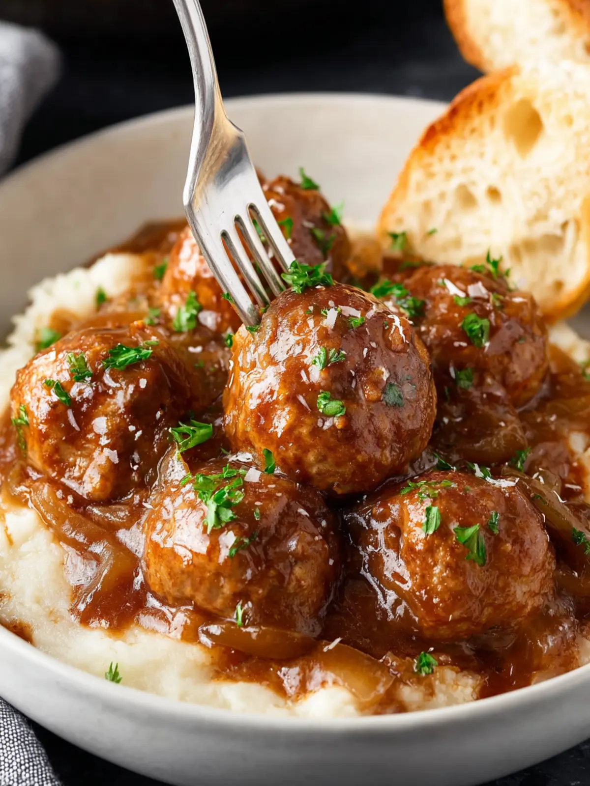 Delicious meatballs slow-cooked in a savory French onion soup sauce, topped with melted Gruyere cheese.