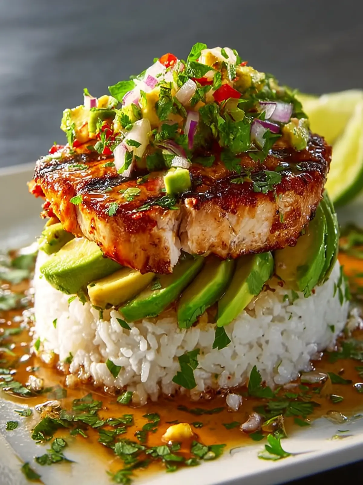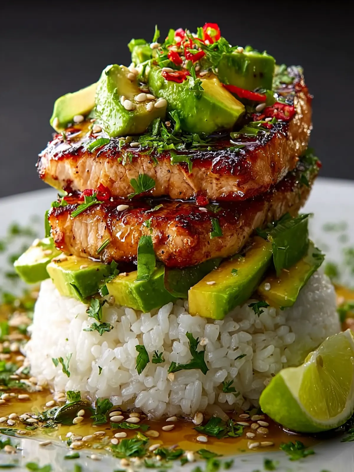 Delicious Honey Lime Chicken: Irresistible Avocado Rice Stack