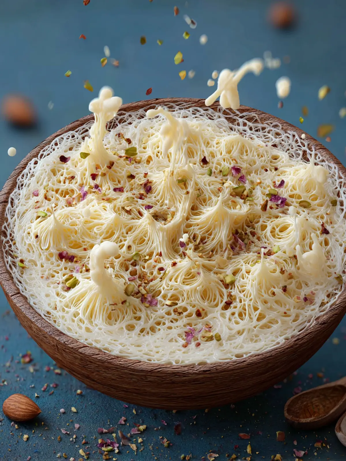 A delightful dessert made with pheni, nuts, and creamy milk.