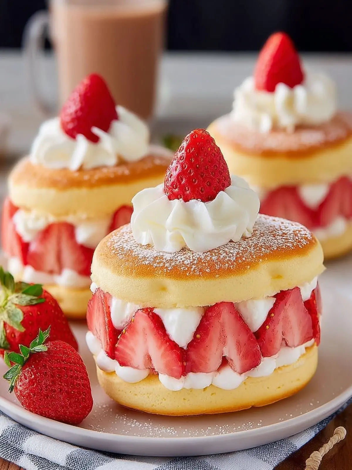 11. Assembly: Take one pancake as the base. Spread a layer of whipped cream over it. Arrange sliced strawberries over the cream. Spread another layer of whipped cream and top with another pancake.