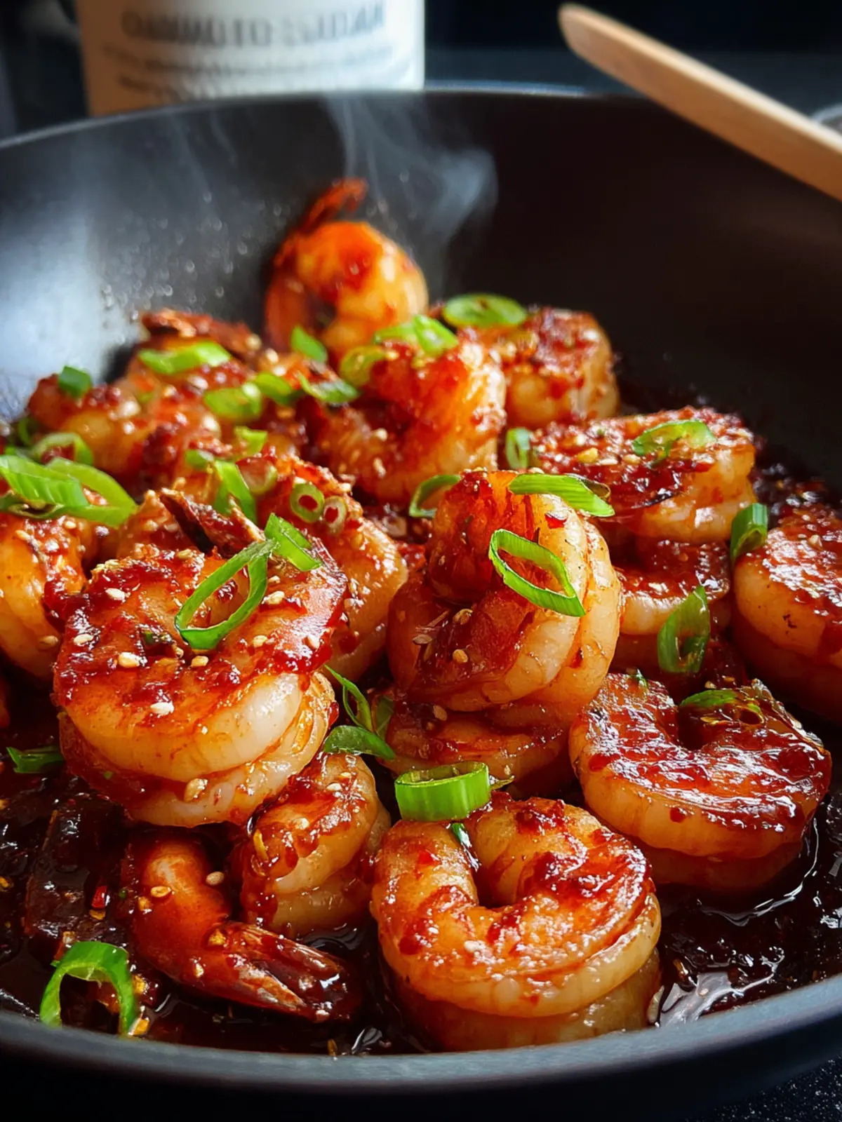 - Sprinkle green onions and sesame seeds over the cooked shrimp. Toss gently to coat.