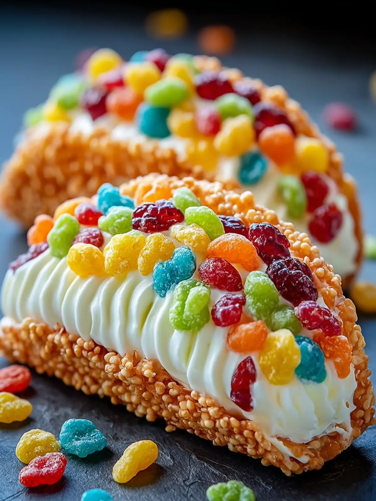 Delicious and fun cheesecake-filled taco shells made from fruity cereal, perfect for a colorful dessert!