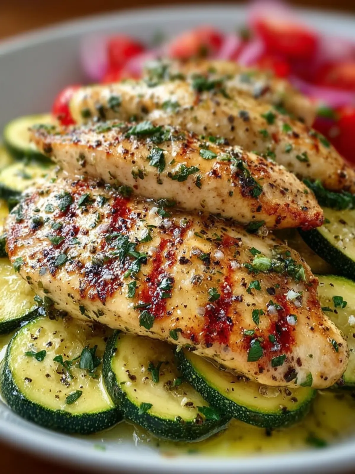 A delicious and healthy sautéed chicken dish with zucchini, garlic, and fresh parsley.