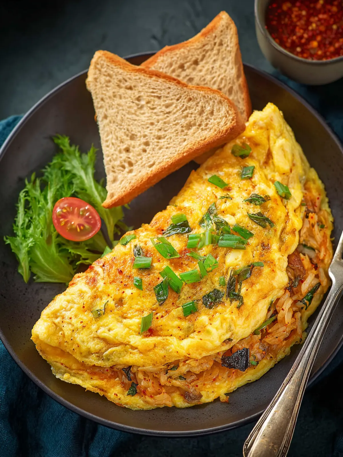 Fresh Salad: A crisp side salad with mixed greens, cucumber, and cherry tomatoes balances the rich flavors of the kimchi. A light vinaigrette adds zest without overpowering the omelette.
