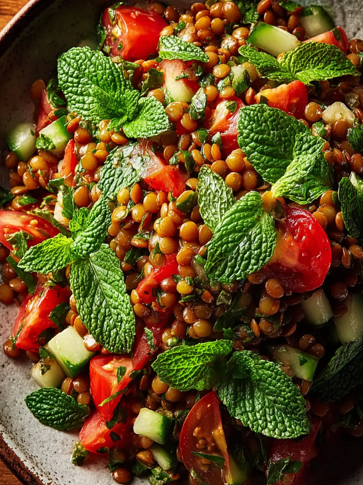 A fresh and healthy tabbouleh salad made with green lentils, herbs, and vegetables, perfect for a light meal or side dish.