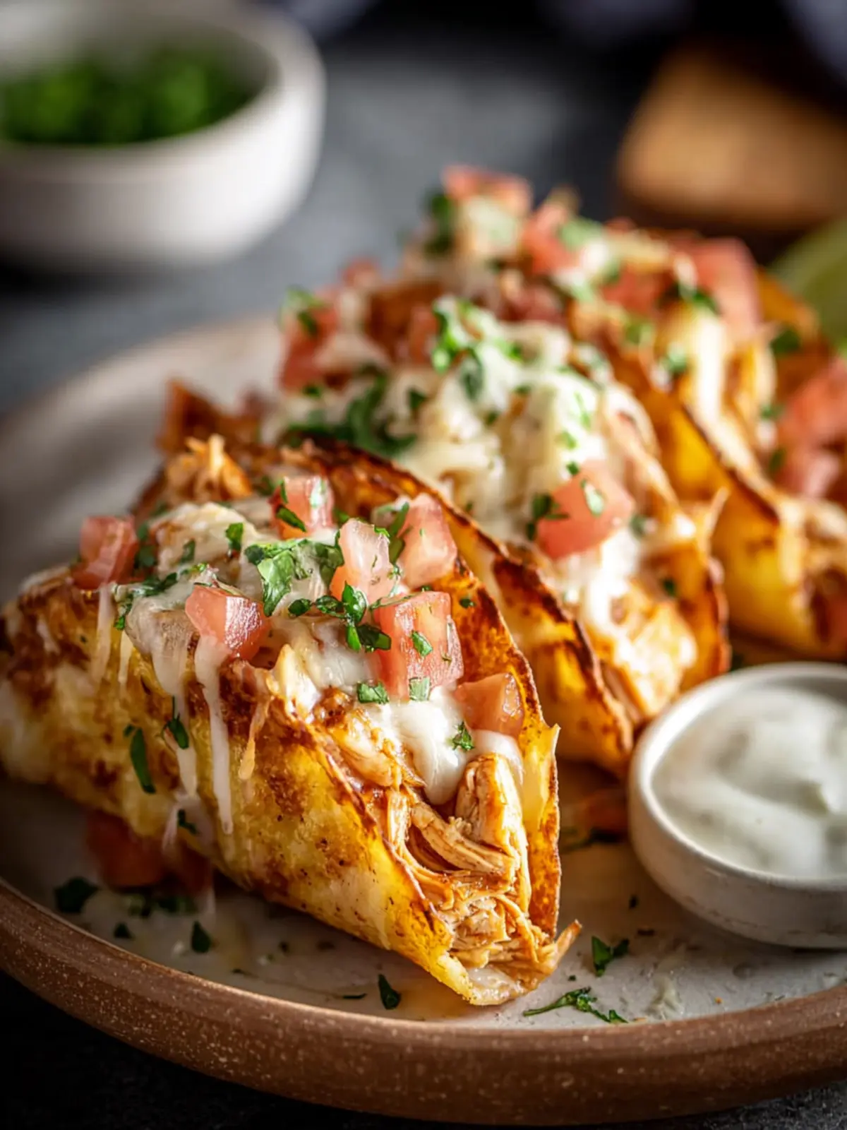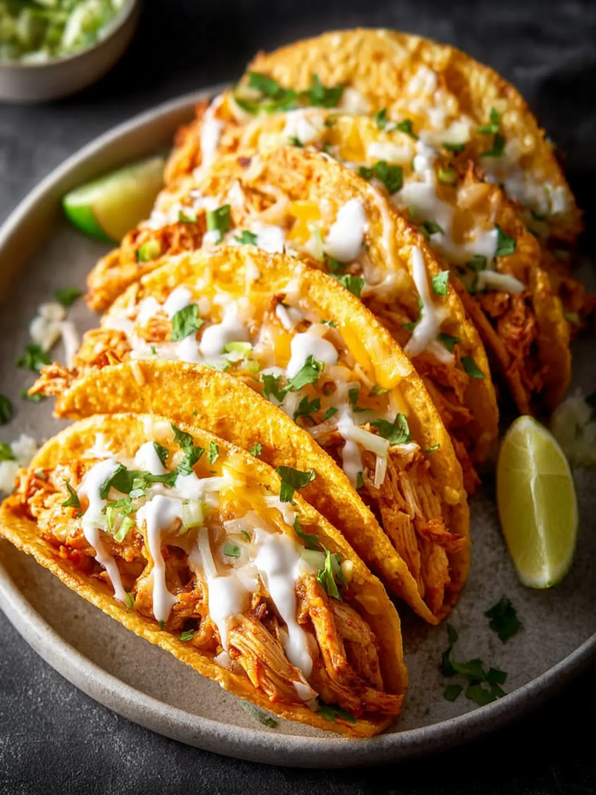 Delicious mini tacos filled with shredded chicken, perfect for a quick meal or snack.