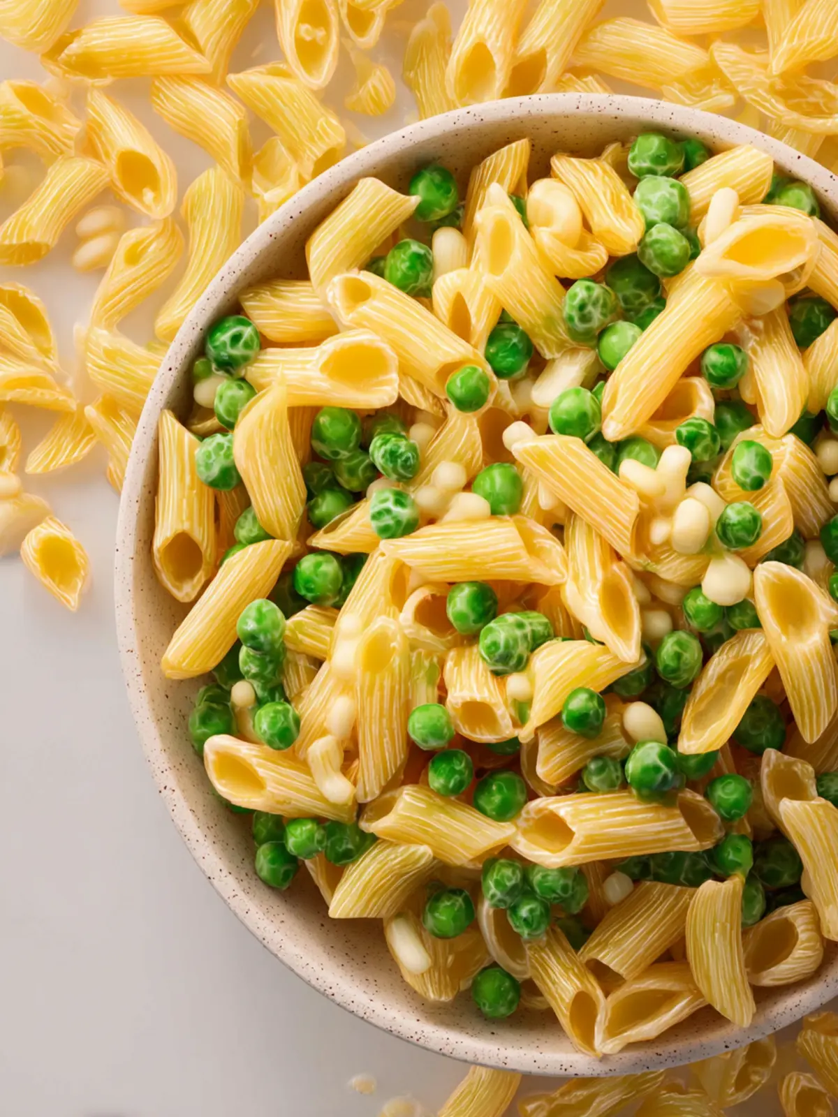 This simple and delightful pasta dish features small shaped pasta mixed with sweet peas and a creamy sauce.