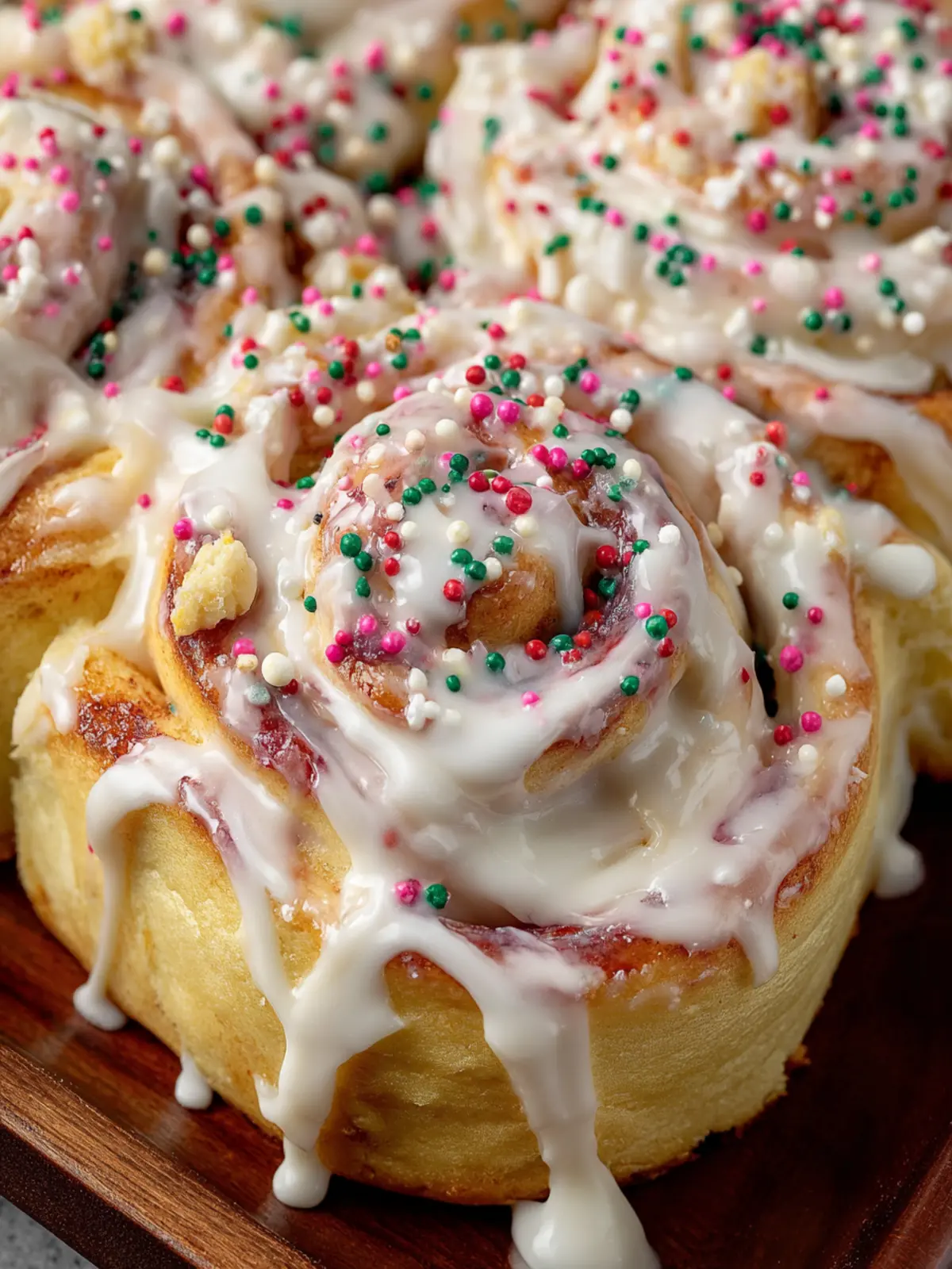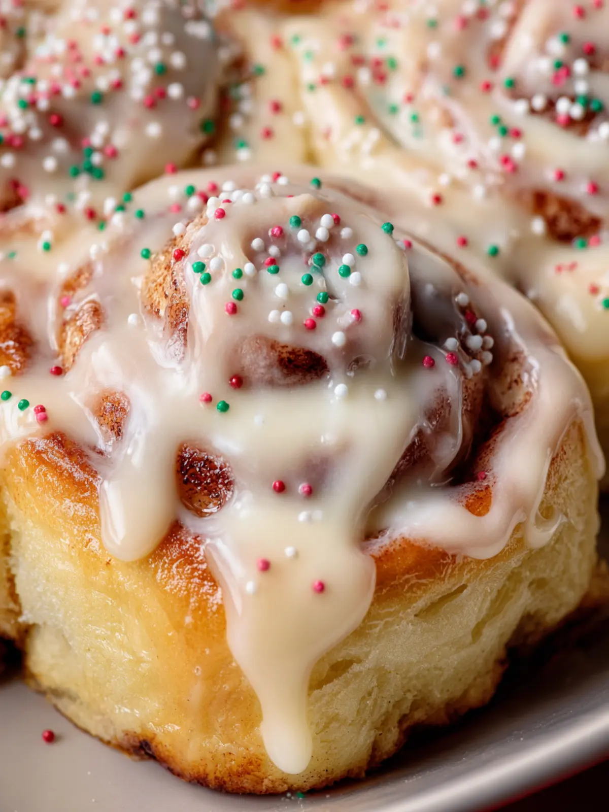 Delicious cinnamon rolls topped with creamy icing and festive sprinkles.