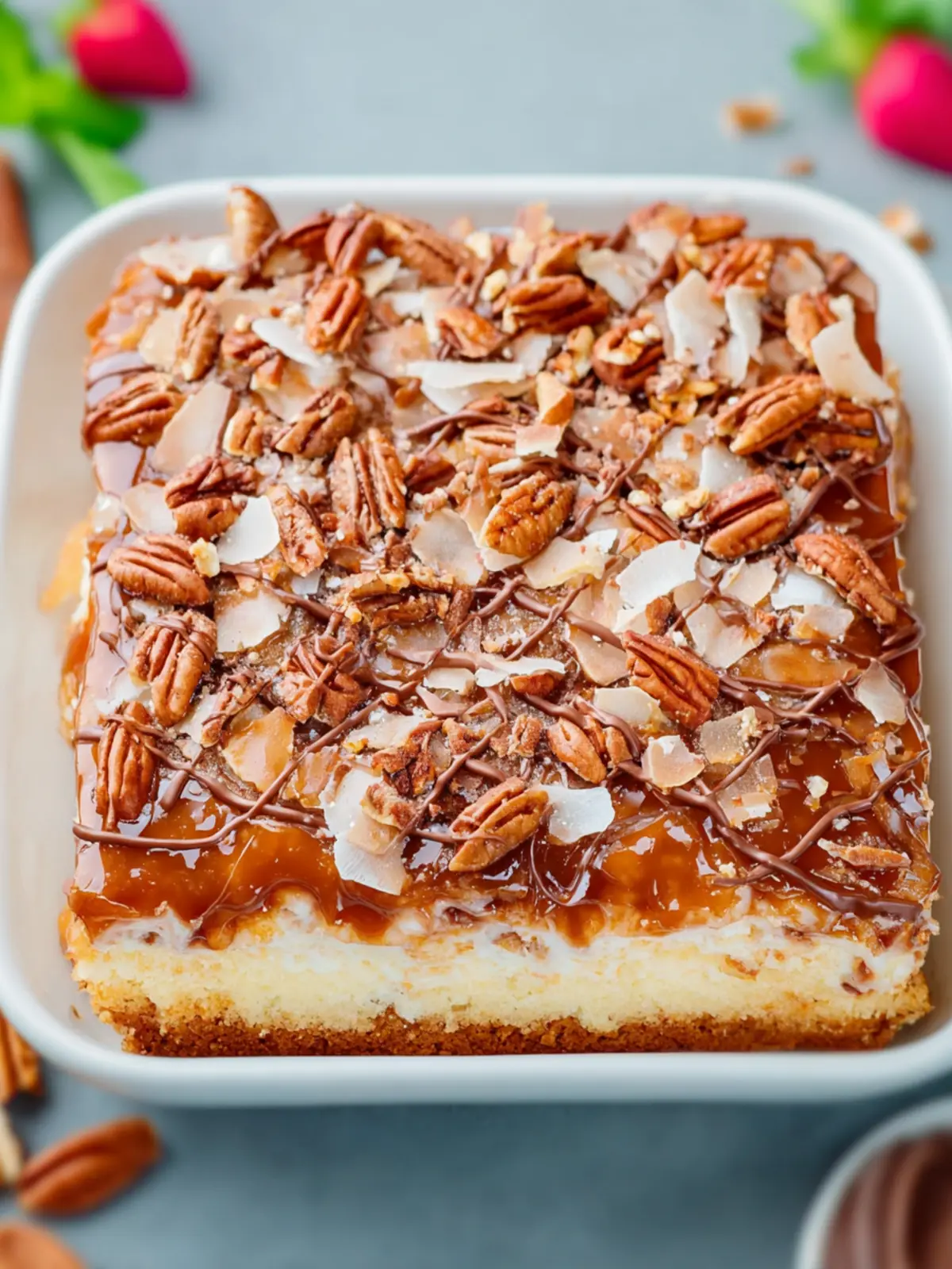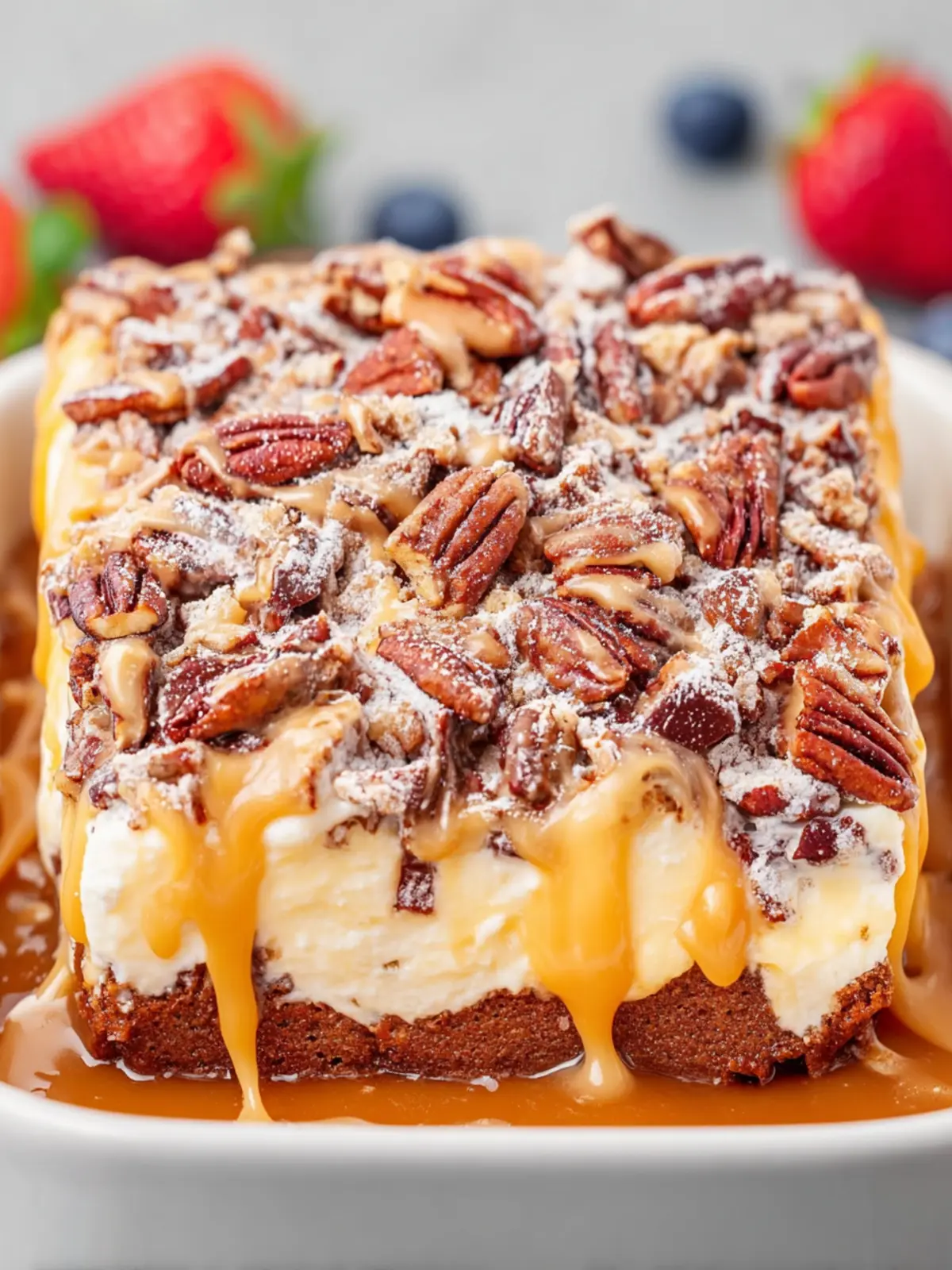 Caramel Sauce: A generous drizzle of caramel sauce makes this turtle poke cake truly special. It adds a gooey, sweet texture that binds all the flavors together harmoniously.